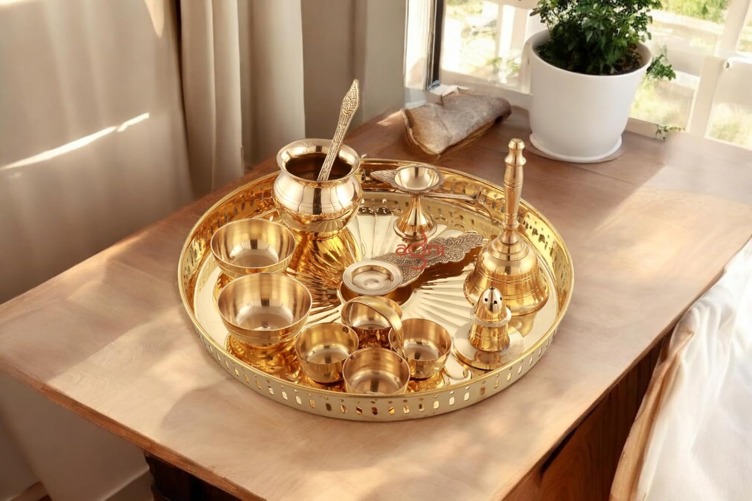 This beautiful pooja thali set is made of brass in an excellent finish. It contains everything one needs.