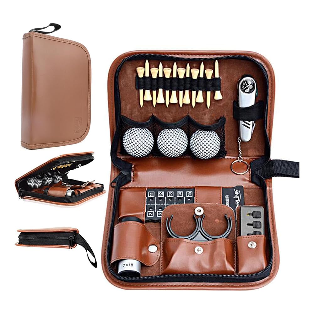 This accessories set comes with 3 balls, rangefinder, cleaning brush, 12 Tees, a multifunctional divot tool, Golf Clip Ball Holder and a scorer. All wrapped up in a neat and elegant looking leather case.