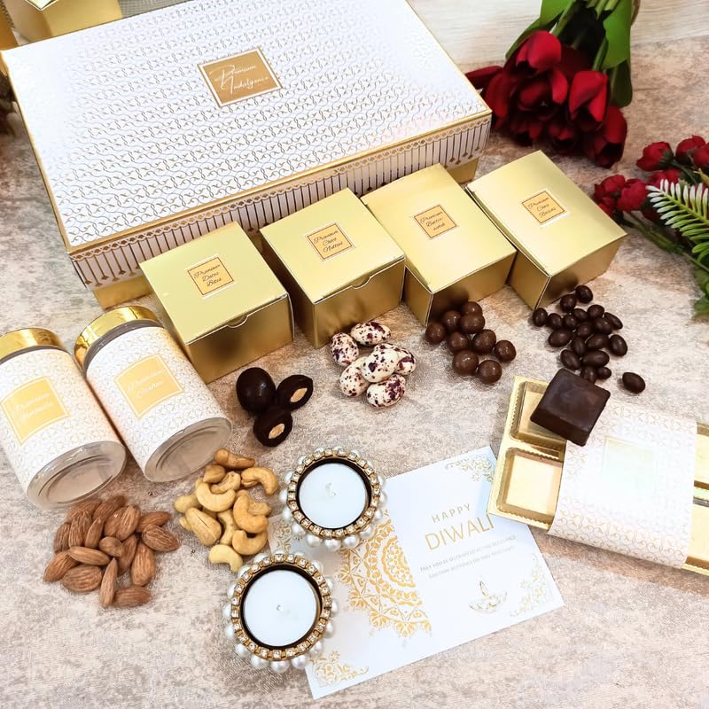 Here's a perfect Diwali theme gift to be given to relatives, friends, office staff, you name it. The box is sturdy and well made, inside you will find a greeting card, two candles with pearls around them (not real of course), chocolates, dry fruits and cookies.